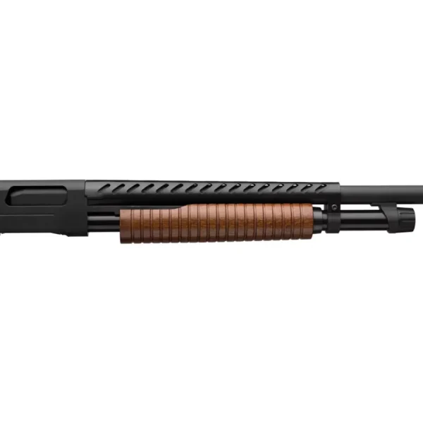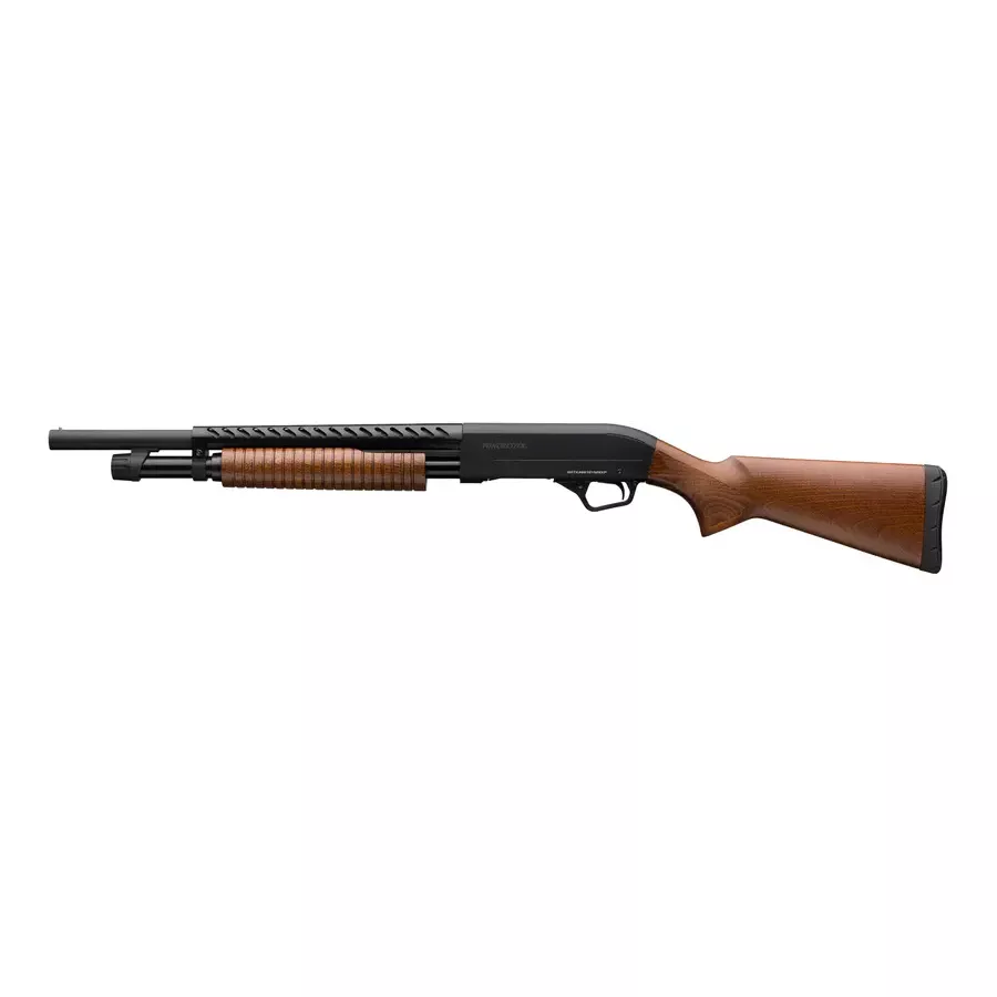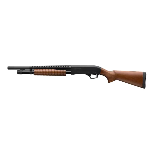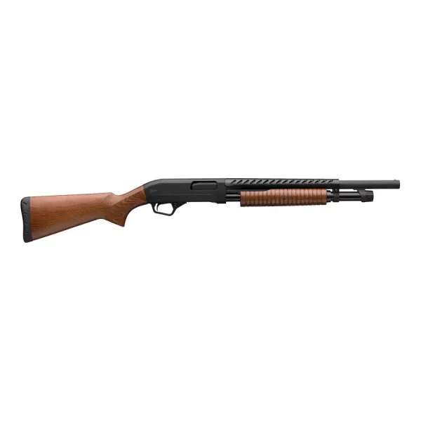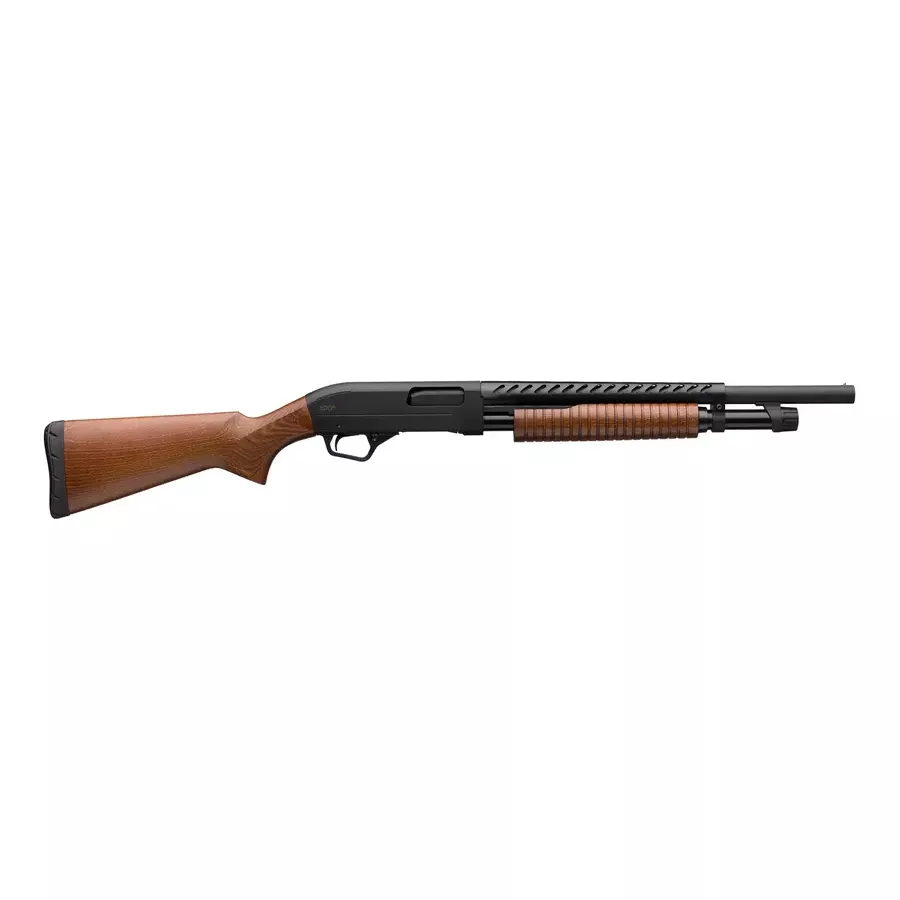 Model Trench wyróżnia się klasyczną estetyką – satynowe wykończenie drewnianej kolby, tradycyjne czółenko w stylu „corncob”, a do tego czarna, kompaktowa konstrukcja, która przywodzi na myśl strzelby taktyczne znane z zastosowań służb mundurowych.
